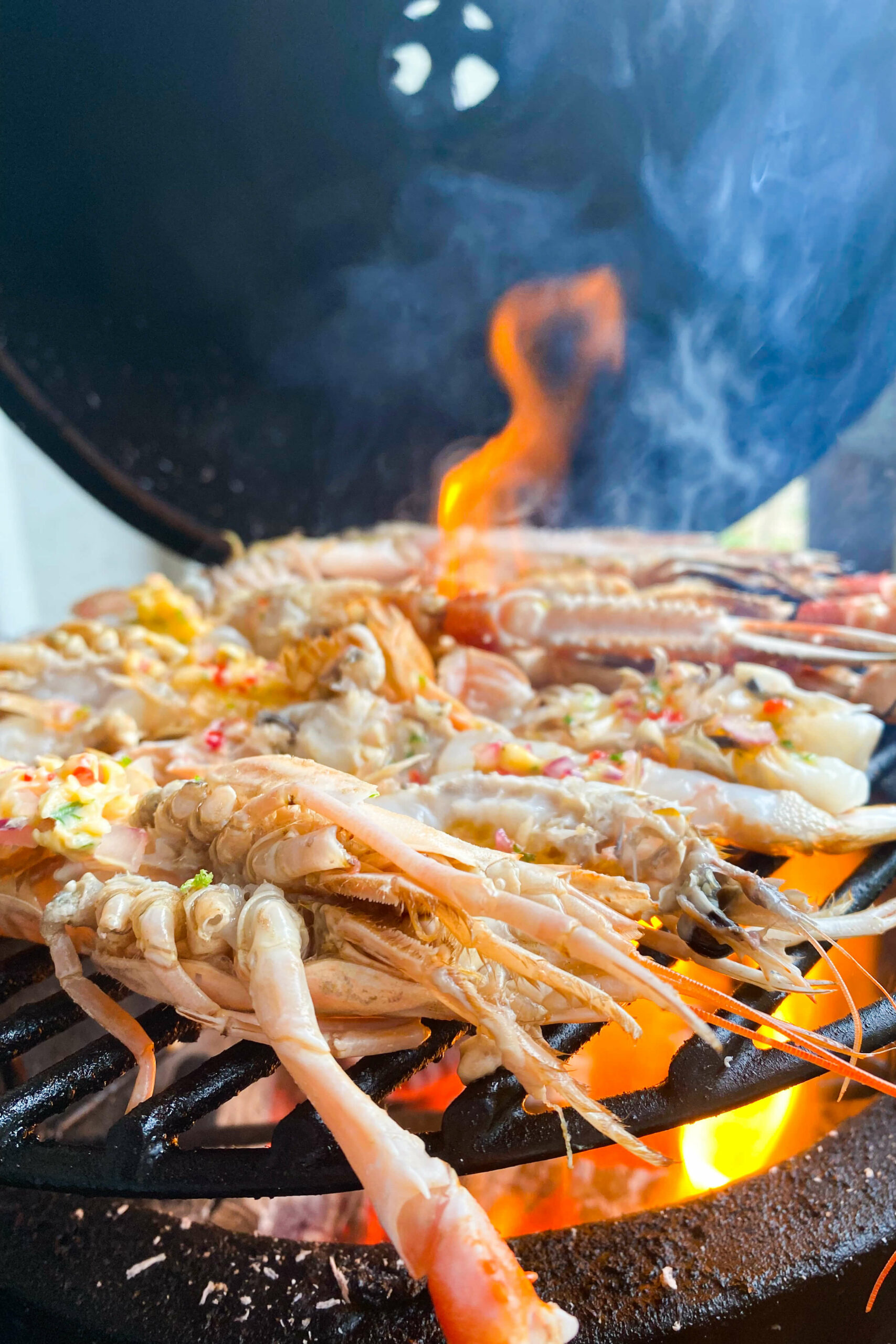 - Verhit de bbq. Zorg ervoor dat de kolen goed aan zijn en de bbq flink fikt. Leg de langoustines erop met de schil naar beneden. Schep in elke langoustine wat van de kruidenboter met een klein lepeltje. Haal de langoustines zodra ze wit kleuren (na ongeveer +/- 2 minuten) van de bbq af. Smeer in met nog wat extra kruidenboter. Enjoy!