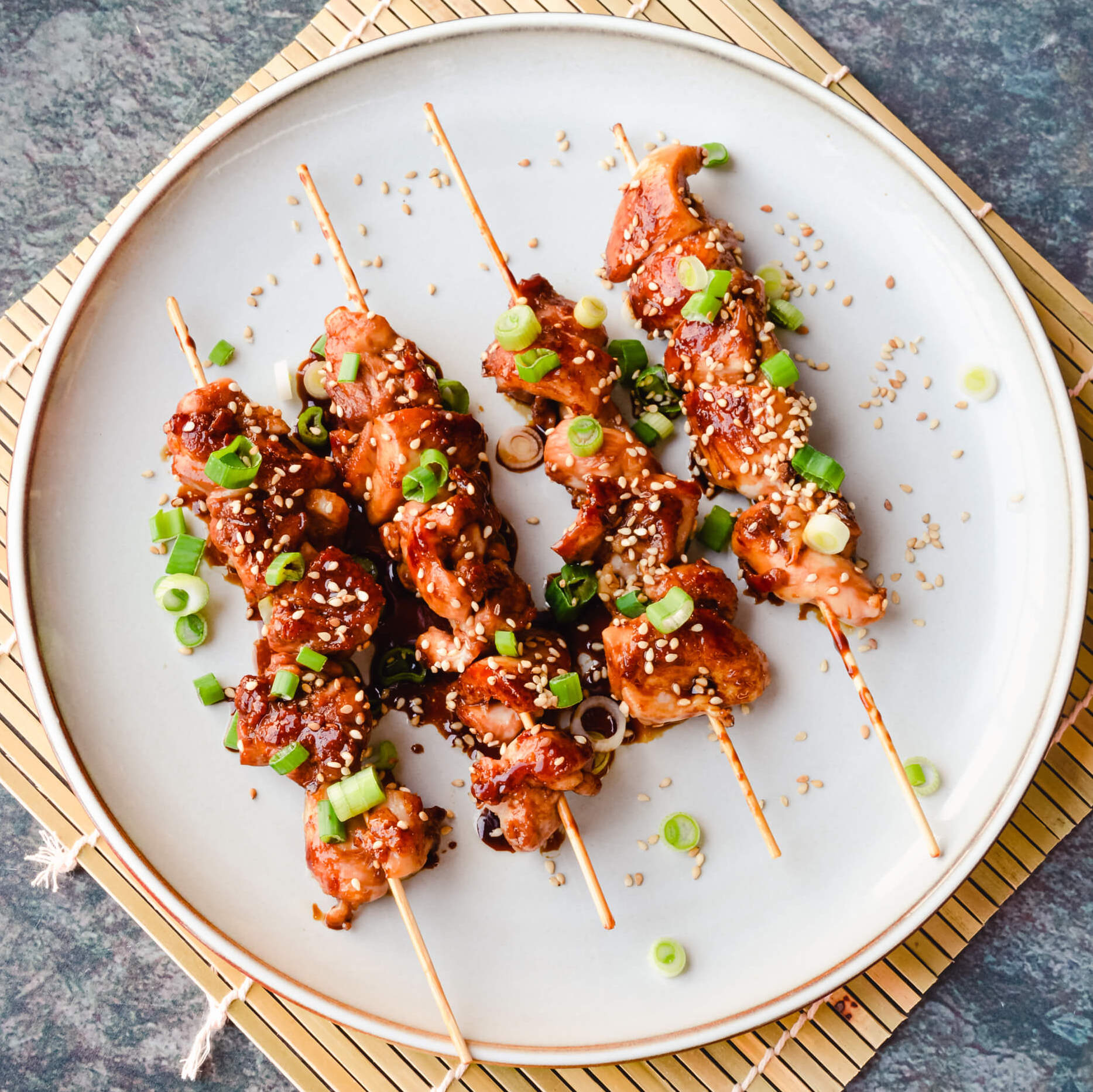 Lak af met de yakitori saus. Haal de kip spiesjes uit de pan en lak ze af met de yakitori saus. Dit gaat het beste met een keukenkwastje. Leg ze op een mooi bord en bestrooi met lente ui en sesamzaad.
