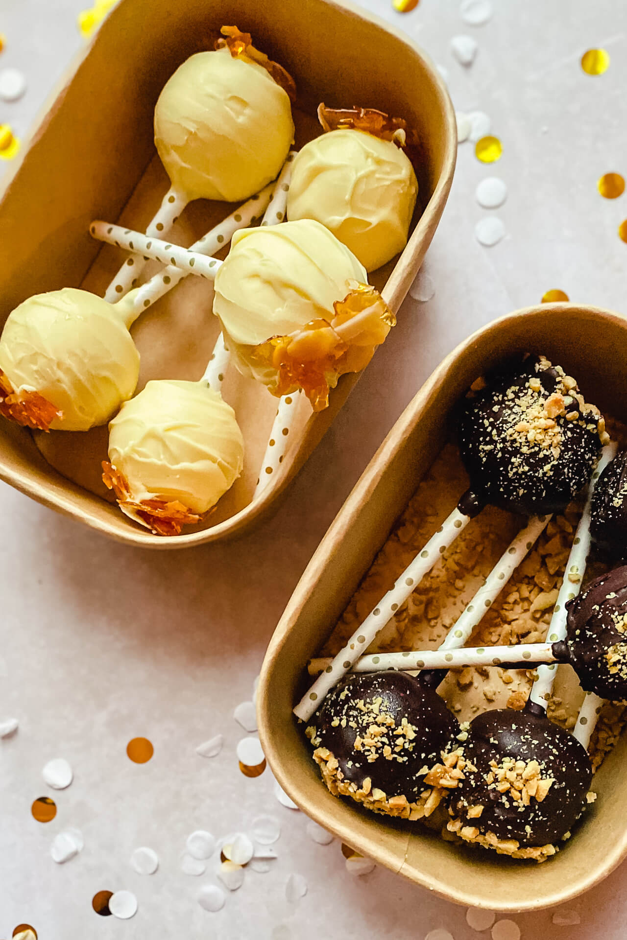Smelt de witte chocolade au bain marie. Het is handig om eerst de ene smaak lolly's te dippen en daarna de andere in verband met het snelle smeltproces van de lolly's. Wanneer de witte chocolade zo goed als gesmolten is, haal je de lolly's met citroen smaak uit de vriezer en dip je deze een voor een in de witte chocolade en daarna in de praline. Tip: Doe de chocolade in een smal glas, dat dipt wat makkelijker. Laat ze even kort uitlekken in een glas die even hoog is als de rietjes/stokjes. Zet de lolly's daarna in de koelkast tot gebruik. Je kunt ze een dag van de voren maken. Deze stap herhaal je ook voor de koffie/kardemom lolly's met pure chocolade.